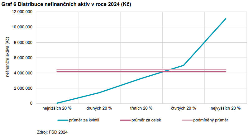 V roce 2024 byly podle nefinančních aktiv tři nejnižší kvintily pod průměrnou hodnotou ukazatele a dva horní kvintily měly vyšší hodnotu než průměrnou.