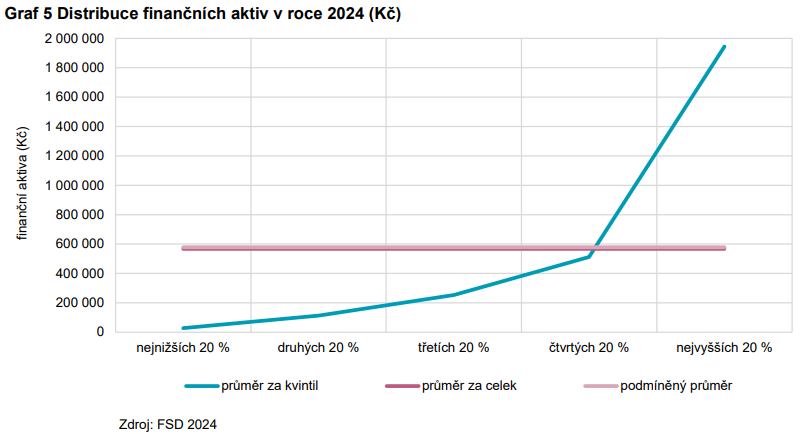 V roce 2024 měly tři pětiny nejchudších domácností finanční aktiva v nižší hodnotě, než je celorepublikový průměr, domácnosti ve čtvrtém kvintilu dosahovaly průměrné hodnoty. Pětina nejbohatších domácností tento průměr vysoce převyšovala a vlastnila 68 % všech finančních aktiv.