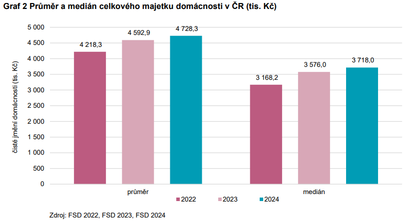 Graf 2 zobrazuje průměry a mediány majetku hospodařících domácností v ČR. Průměr celkového majetku domácností v roce 2024 činil 4,7 mil. Kč (meziročně přibližně o 0,1 mil. Kč více). Vyšší hodnoty průměrného majetku domácností než prostřední hodnoty (3,7 mil. Kč v roce 2024) způsobuje menší počet „výrazně bohatších“ domácností.