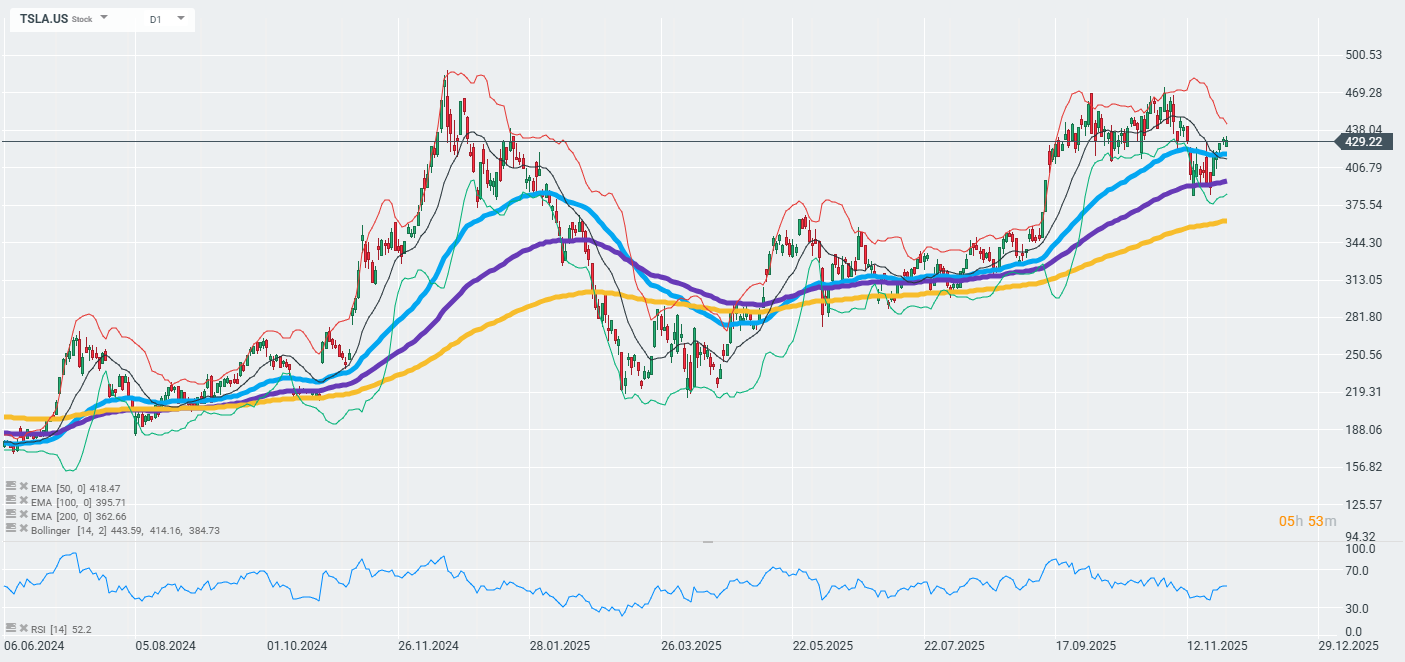 Akcie TSLA si udržují dlouhodobý uptrend poté, co se minulý týden vrátily nad 50denní EMA (modrá křivka v grafu). Zdroj: xStation