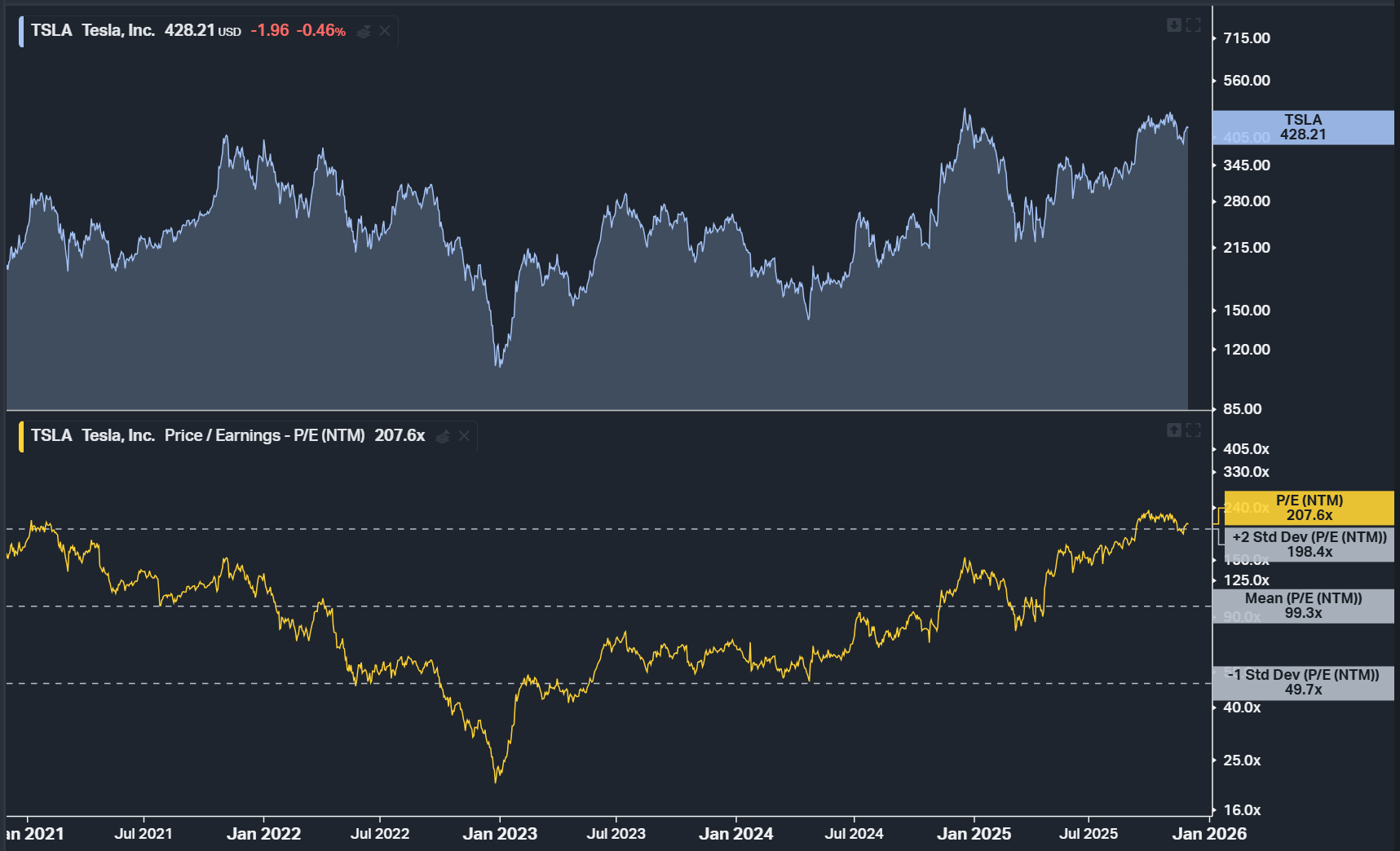 Forward P/E poměr akcií Tesly pro následujících 12 měsíců se aktuálně drží poblíž nejvyšších hodnot za posledních pět let. Zdroj: Koyfin