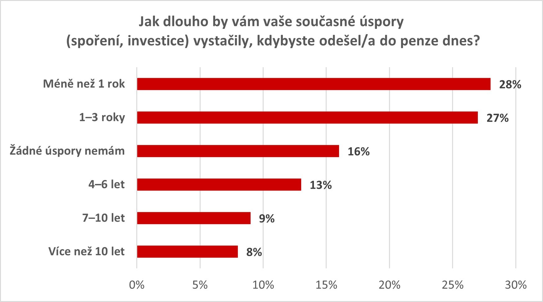 Když se Čechů zeptáme, jak dlouho by jim vystačily jejich současné úspory, kdyby odešli do penze dnes, začne se objevovat propast mezi představami a realitou. Největší část lidí — 28 % — má úspory jen na méně než jeden rok života v penzi. Dalších 27 % má úspory maximálně na tři roky. To znamená, že přibližně polovina populace je finančně připravena na pouhé 1–3 roky života bez příjmů ze zaměstnání.