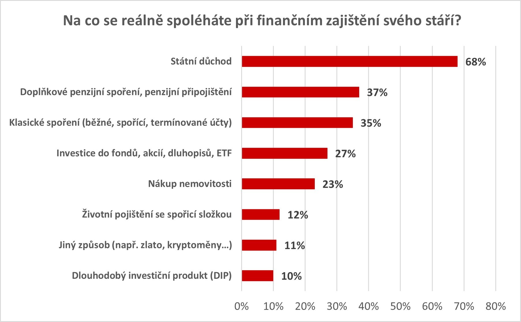 Další finanční nástroje, na které se lidé v souvislosti se zajištěním penze spoléhají, následují s velkým odstupem. Na doplňkové penzijní spoření nebo penzijní připojištění spoléhá 38 %, na klasické spoření (běžné a spořicí účty) 35 %, na investice do fondů, akcií či dluhopisů 27 %, nemovitost jako pojistku pro penzi využívá 23 % a na dlouhodobý investiční produkt se spoléhá pouze 9,9 % lidí. V zemi, která stárne rychleji než Evropa, to není udržitelná strategie.