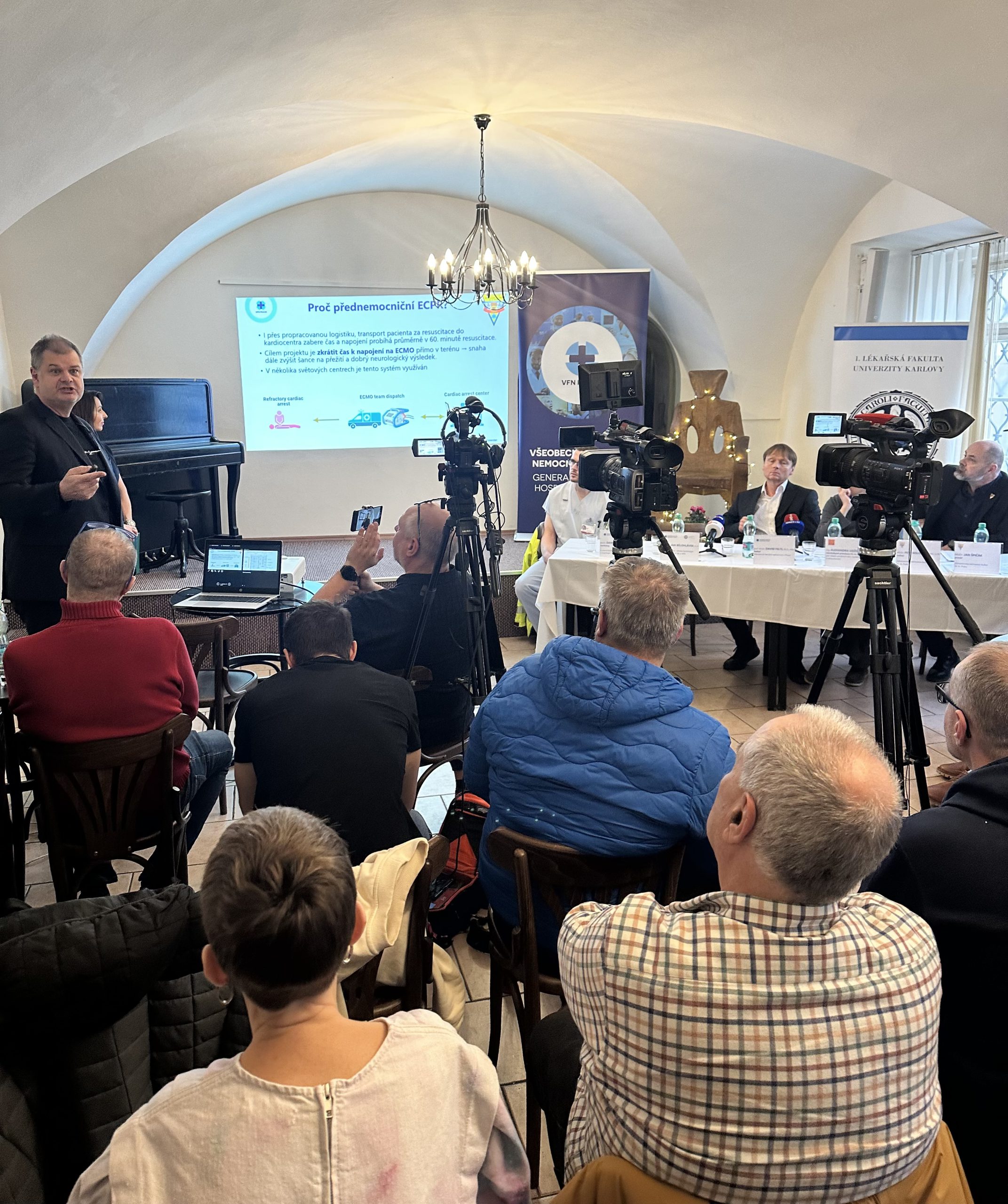 Náhlá srdeční smrt je jednou z nejčastějších příčin úmrtí nejen v Česku. Pro přežití těchto kriticky nemocných pacientů je stěžejní kvalitně nastavený systém přednemocniční a časné nemocniční péče – včasná identifikace náhlé zástavy oběhu, vedení laické pomoci dispečerem zdravotnické záchranné služby (ZZS), co nejrychlejší zásah posádky ZZS na místě, kvalitní nepřerušovaná resuscitace, rychlý převoz do nemocnice a ve speciálních případech i napojení na mimotělní oběh (ECMO). Na tiskové konferenci, primář prof. MUDr. Jan Bělohlávek, Ph.D. z II. interní kliniky – kliniky kardiologie a angiologie 1. LF UK a VFN a zástupci Zdravotnické záchranné služby hl. města Prahy detailně popsali, jak ECPR (extrakorporální kardiopulmonální resuscitace) tým VFN nově dokáže pacienta se srdeční zástavou rychleji napojit na mimotělní oběh přímo v terénu.
