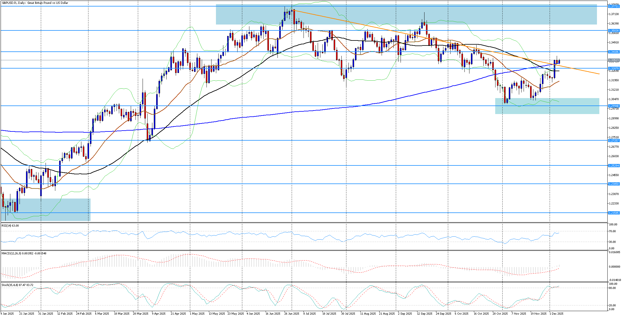 GBP/USD během středeční seance výrazně posílil, když prorazil střednědobou klesající trendovou linii a následně vystoupal nad 200denní jednoduchý klouzavý průměr (SMA). Tento pohyb byl podpořen revizí britského PMI služeb za listopad směrem vzhůru, což zlepšilo důvěru v britskou ekonomiku. Současně slábnoucí americký dolar, ovlivněný očekáváním snížení sazeb Fedu příští týden, vytvořil dodatečný prostor pro růst libry. Po dosažení zisků se pár mírně stáhl, avšak nadále se drží nad klíčovou úrovní 1,3300, což udržuje technický obrázek pozitivní. Pokud kupci znovu převezmou iniciativu, může se trh odrazit v okolí 200denního SMA a směřovat k rezistenci u 1,3400. Její překonání by dále zlepšilo výhled a mohlo by otevřít cestu k dalšímu cíli kolem 1,3470. Naopak pokles ceny zpět pod prolomenou klesající trendovou linii by oslabil krátkodobý býčí scénář. První podpora leží poblíž 1,3260, kde se nachází 50denní SMA. Níže pak přichází do hry úroveň 1,3210, jejíž prolomení by mohlo upevnit medvědí tlak. Technické indikátory aktuálně podporují tendenci růstu. Stochastický oscilátor se nachází nad úrovní 80, což naznačuje překoupené podmínky, ale zároveň potvrzuje silné momentum. MACD zůstává nad nulovou linií, což dále podporuje býčí scénář. GBP/USD tak vstupuje do klíčové fáze. Pár se drží nad zásadními technickými úrovněmi, které zvýhodňují pokračování růstu, avšak finální směr bude záviset na nadcházejících makro datech a rozhodnutí Fedu o měnové politice.