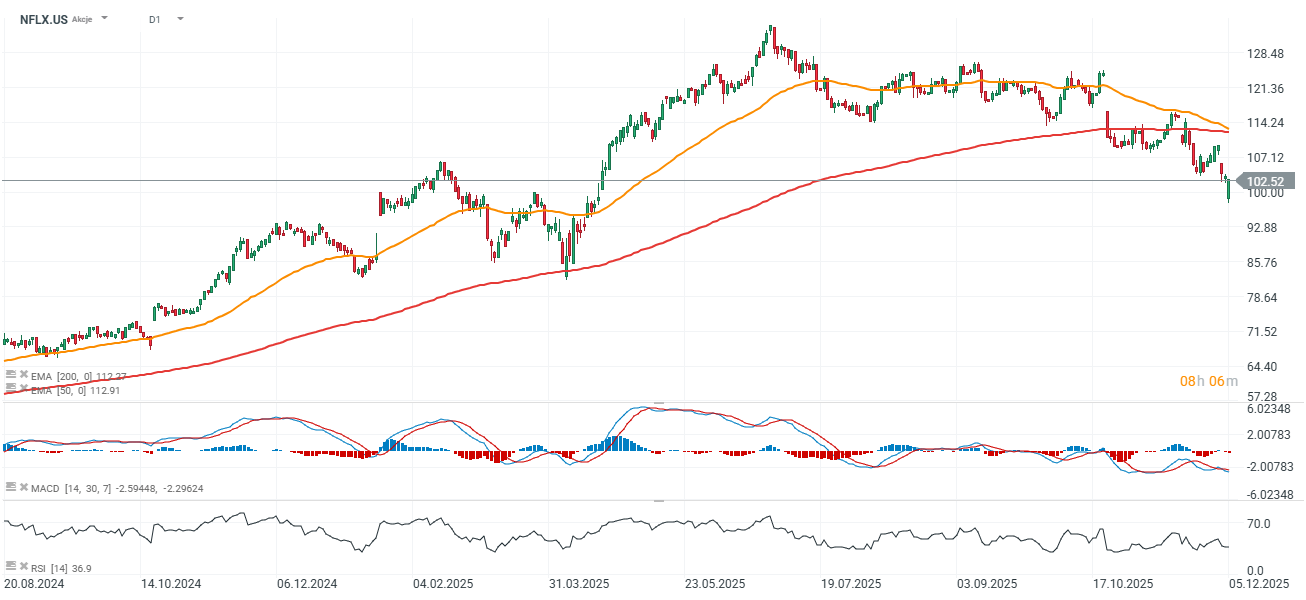 - Netflix a Warner Bros. Discovery – Akcie společností Netflix a Warner Bros. Discovery oslabily přibližně o 3 % a 1 %, když Netflix v pátek oznámil, že souhlasil s akvizicí WBD za cenu 27,75 dolaru za akcii. Trh reagoval na tuto výraznou transakci v odvětví chladně, přestože jde o jednu z nejvýznamnějších dohod v odvětví. Akcie Netflixu se po otevření trhu začaly zotavovat, ale stále se obchodují zhruba 10 % pod 200denním EMA.