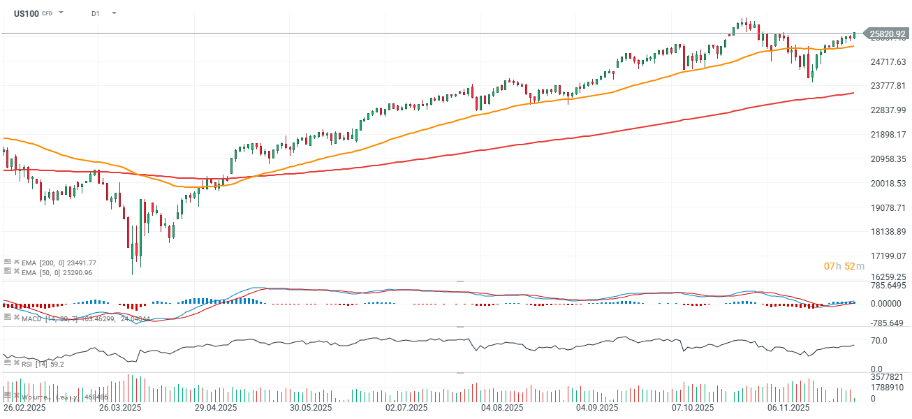 Americké indexy pokračují v růstu, přičemž technologický sektor (polovodiče, Big Tech) a finanční tituly vedou zisky. Údaje z University of Michigan ukázaly silnější než očekávaný pokles inflačních očekávání, a to jak v jednoletém horizontu, tak v pětiletém výhledu. Mezitím údaj o inflaci PCE přesně odpovídal odhadům, když v říjnu meziročně dosáhl 2,8 %. Výsledky na této úrovni se zdají být podpůrné pro trhy, zejména vzhledem k tomu, že osobní spotřeba zůstala solidní, když jen mírně zaostala za očekáváním ve skutečných hodnotách, s meziměsíční stagnací.