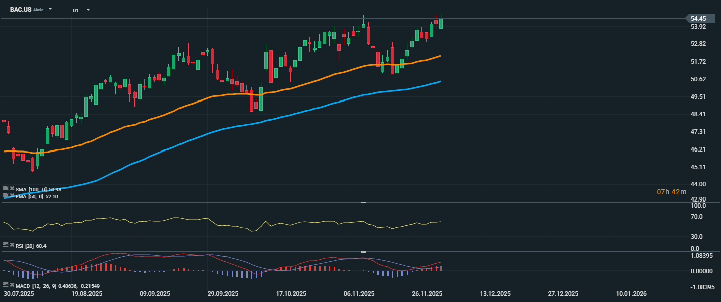 Akcie společnosti Bank of America se aktuálně obchodují na hodnotě 54,45 USD, tedy poblíž svých lokálních maxim z předešlých měsíců. Cena se stabilně drží nad oběma klouzavými průměry – EMA 50 (52,10 USD) i SMA 100 (50,48 USD), což potvrzuje pokračující býčí trend. RSI se pohybuje na úrovni 60,4, tedy v lehce překoupené zóně, ale stále s prostorem pro další růst bez bezprostředního rizika obratu.