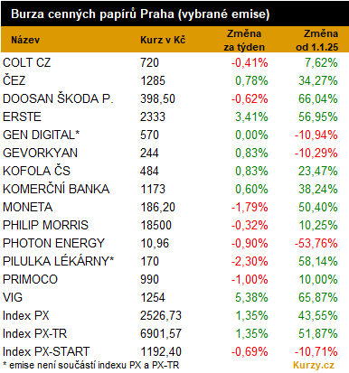 Světové akciové trhy, po enormním optimismu z předcházejícího týdne, v úvodu prosince ztěžka hledaly další pozitivní impulsy. Nakonec si však zisky připsaly. V zámoří např. širší index S&P posílil o 0,3 % a dále se tak přiblížil zpět svým historickým maximům z října. Nové naděje, zatím plané, na ukončení války na Ukrajině pomáhaly v Evropě v porovnání k větším ziskům. Například prestižní index EURO STOXX 50 přidal 1 %, pražská burza však opět předvedla svou dominanci. Přestože polovina indexových emisí utrpěla v týdnu ztráty, index PX si polepši o solidních 1,35 % a zakončil na novém historickém maximu téměř 2 527 bodů. Při započtení dividend, tedy dle sesterského indexu PX-TR, tak pražská burza rozšířila letošní zisky již na téměř 52 %.