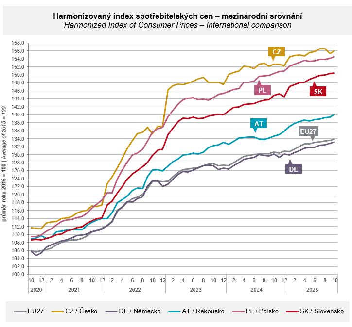Podle předběžných výpočtů HICP v listopadu v Česku meziměsíčně klesl o 0,4 % a meziročně vzrostl o 1,8 % (v říjnu o 2,3 %). Podle bleskových odhadů Eurostatu byla meziroční změna HICP v listopadu 2025 za Eurozónu 2,2 % (v říjnu 2,1 %), v Německu 2,6 % a na Slovensku 3,8 %. Nejvíce ceny v listopadu vzrostly v Estonsku (o 4,7 %) a nejméně na Kypru (o 0,2 %).