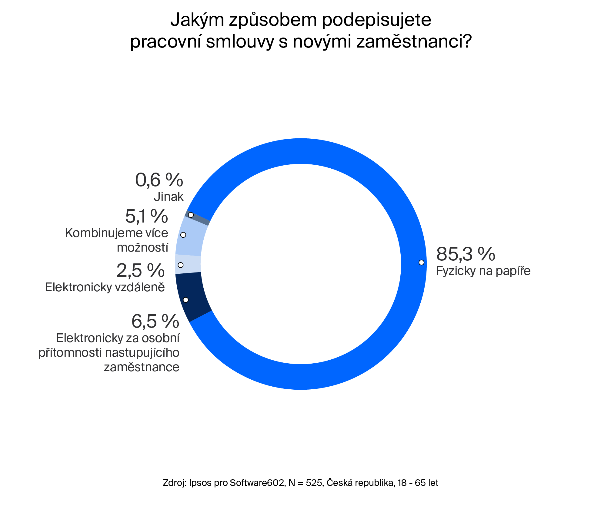 Realita firem zůstává navzdory debatám o digitalizaci převážně papírová. Když jsme se v Software602 spolu s agenturou Ipsos dívali na to, jak české firmy dnes podepisují pracovní smlouvy, výsledek byl poměrně konzervativní. Elektronické podepisování se zatím objevuje spíše výjimečně a nejčastěji tam, kde k němu existuje silný impulz ze strany vedení nebo potřeba zefektivnit složitější procesy.