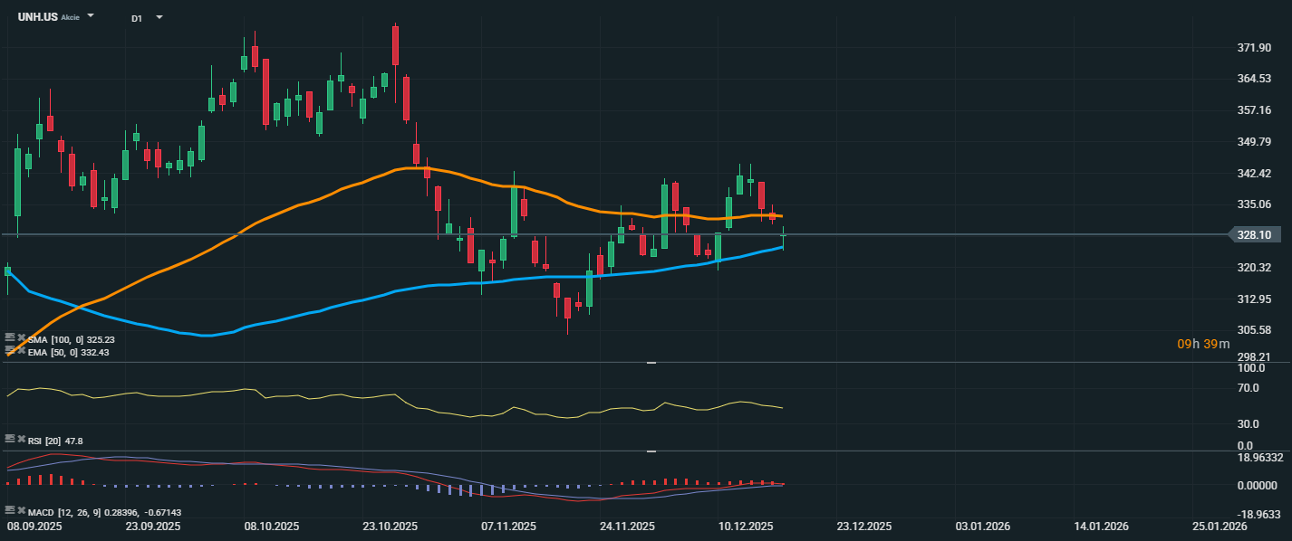 Akcie společnosti UnitedHealth Group se aktuálně obchodují na úrovni 328,10 USD, přičemž se cena drží mezi klouzavými průměry SMA 100 (325,23 USD) a EMA 50 (332,43 USD). Tento vývoj odráží nejistotu trhu. RSI se pohybuje těsně pod neutrální úrovní 50, což značí mírnou převahu prodejního tlaku, ale bez známek přeprodanosti. Proražení nad EMA 50 by mohlo otevřít cestu k růstu směrem k 340–350 USD. Naopak pokles pod SMA 100 by znovu potvrdil slabost a možnost retestu listopadových minim pod 310 USD.