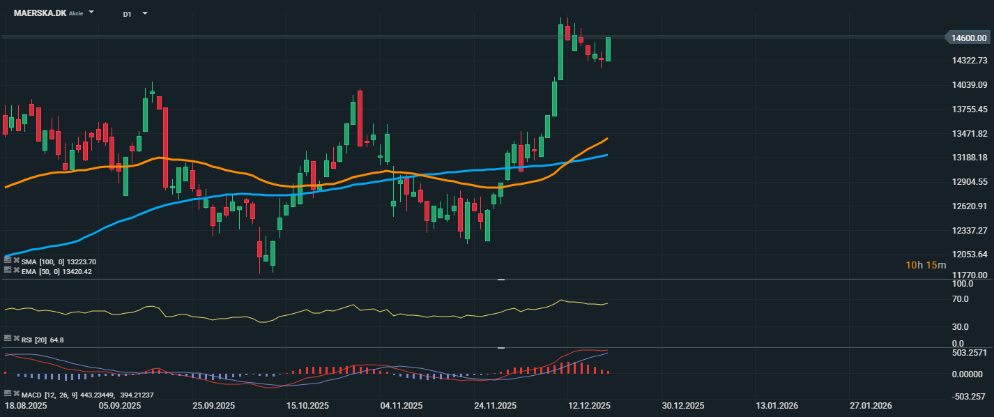 Akcie společnosti Maersk se aktuálně obchodují na ceně 14 600 DKK, tedy nedaleko od svého nedávného maxima. Akcie zaznamenaly silný růstový trend na konci listopadu, kdy prorazily nad oba klíčové klouzavé průměry – EMA 50 (13 420 DKK) a SMA 100 (13 223 DKK) – a tento průraz byl doprovázen silným býčím momentem. RSI se nachází na úrovni 64,8, tedy těsně pod překoupenou zónou, což značí vysoký zájem kupců, avšak zároveň potenciální prostor pro mírnou konsolidaci.