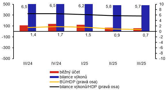 Bilance běžného účtu platební bilance skončila ve třetím čtvrtletí 2025 schodkem 14,0 mld. Kč. Na finančním účtu byl vykázán čistý odliv finančních prostředků do zahraničí (čisté půjčky do zahraničí) ve výši 50,1 mld. Kč, a to vlivem vyššího transakčního nárůstu zahraničních aktiv v porovnání s přírůstkem zahraničních pasiv. Rezervní aktiva ČNB se zvýšila o 127,8 mld. Kč (bez vlivu kurzových a cenových rozdílů).