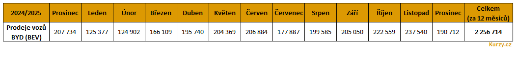 BYD se však přesto loni stala první automobilkou, která dokázala během roku prodat více než 2 mil. elektromobilů. Meziročně o takřka 492 tis. více, resp. rostla o téměř 28 %.