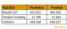Americká Tesla oproti tomu druhým rokem v řadě vykázala pokles prodejů elektromobilů, tentokrát navíc o výraznějších 8,5 %. Zákazníci si jich loni pořídili nakonec jen 1,636 mil., když v samotném 4. čtvrtletí zhruba 418 tis. Před rokem ve 4. čtvrtletí přitom prodeje přesáhly 495 tis. Jak patrno, Tesla na konci roku 2025 vyráběla na sklad...