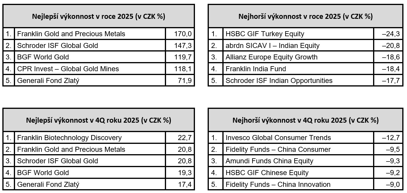 „Společným jmenovatelem nejúspěšnějších fondů bylo zaměření na sektor, který v roce 2025 těžil z kombinace několika faktorů. Zlato se dostalo na historická maxima a za celý rok výrazně posílilo, což z něj učinilo jedno z nejvýkonnějších aktiv posledních desetiletí. K tomuto vývoji přispěla přetrvávající geopolitická nejistota, obavy investorů z dalšího směřování měnové politiky i rostoucí zájem o aktiva, která slouží jako ochrana hodnoty v nestabilním prostředí,“ upozorňuje Petra Hrdličková, investiční analytička Swiss Life Select.