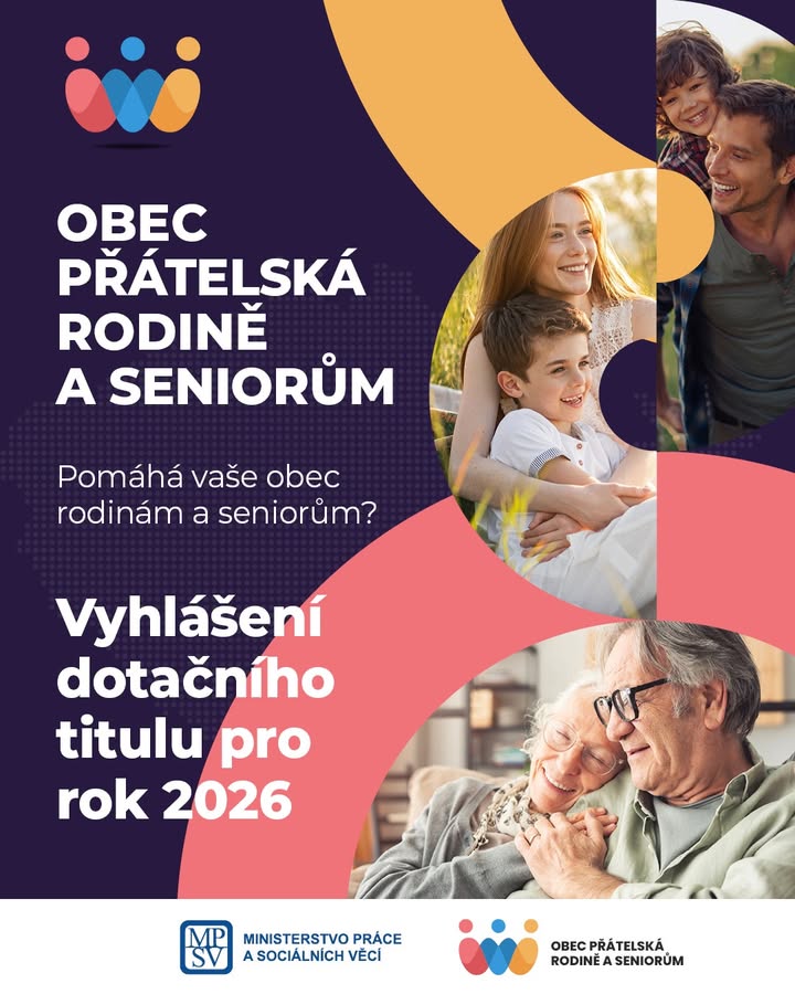 Podrobné informace o tom, jak se dotačního titulu Obec přátelská rodině a seniorům zúčastnit, najdete zde: https://www.mpsv.cz/obec-pratelska-rodine-a-seniorum-2026