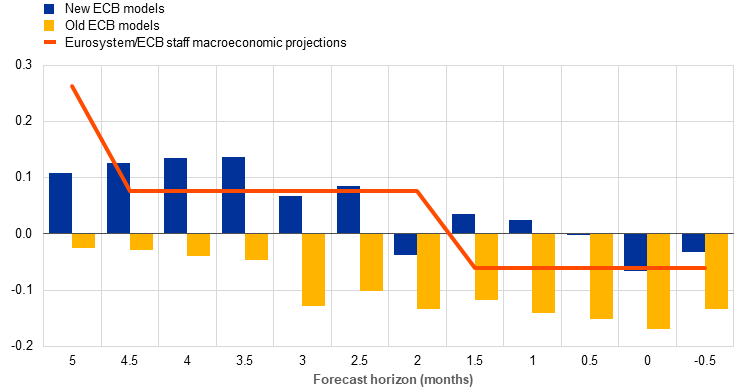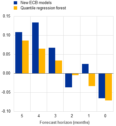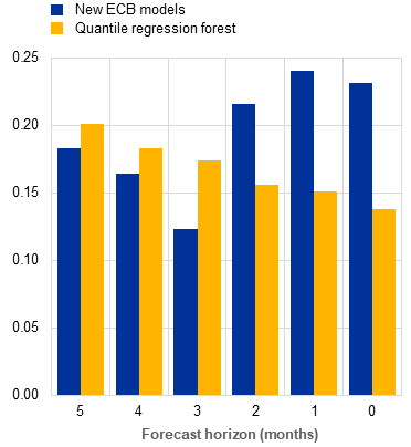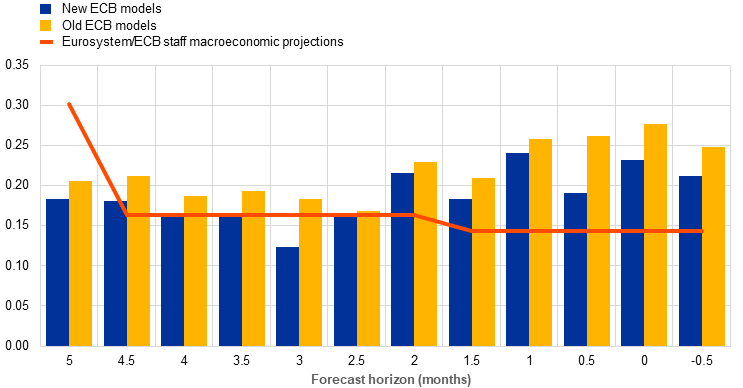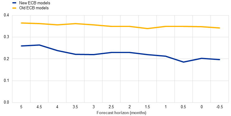 The new ECB models also deliver more accurate density forecasts. In addition to evaluating the point forecasts, the accuracy of the entire forecast distribution is assessed. To this end, the continuous ranked probability score (CRPS), which compares predicted distributions to actual outcomes, is used to evaluate the density forecasts produced by the old and new ECB models. The Eurosystem/ECB staff macroeconomic projections are not included in this evaluation, as they do not provide density forecasts.[12] Chart 2 shows that the new ECB models deliver more accurate probabilities (lower CRPS) than the old ECB models at all forecast horizons. This result is unsurprising, as the inclusion of time-varying volatilities enhances the calibration of the forecast densities.
