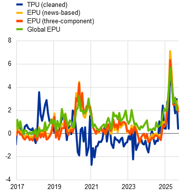Trade policy uncertainty has risen significantly in the face of higher tariffs and tariff threats, adding a new layer of complexity to assessing the global economic outlook. Shifts in tariff and trade policy, unpredictable communication and the move away from rules-based multilateralism towards bilateral leverage have heightened uncertainty for firms and investors. This has influenced sourcing, production and investment decisions, and may weigh on trade dynamics, investment and overall macroeconomic performance. Moreover, uncertainty can affect expectations and dampen activity even in the absence of concrete policy changes. Monitoring it has therefore become crucial to assessing the economic outlook. Trade policy uncertainty has been an important part of the technical assumptions underlying recent rounds of the Eurosystem/ECB staff macroeconomic projections for the euro area.[1]