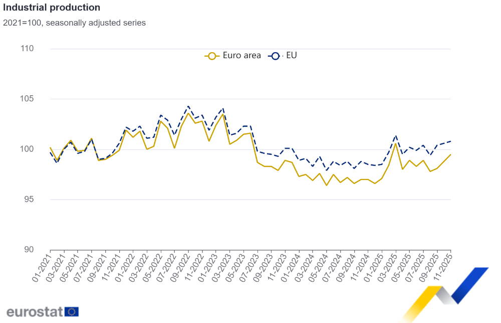 In November 2025, compared with October 2025, seasonally adjusted industrial production increased by 0.7% in the euro area and by 0.2% in the EU, according to first estimates from Eurostat, the statistical office of the European Union. In October 2025, industrial production grew by 0.7% in the euro area and by 0.2% in the EU.