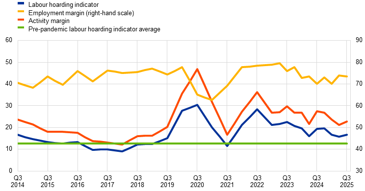 Notes: The activity margin reflects the share of firms that have reported facing a deterioration in their specific business conditions over the previous or current quarter, while the employment margin refers to the share of firms that have not reduced their workforce of all those that reported a deterioration in their business conditions. The ECB’s labour hoarding indicator is the product of both margins. The pre-pandemic average of the labour hoarding indicator is calculated for the period from 2014 to 2019. The latest observations are for the third quarter of 2025.