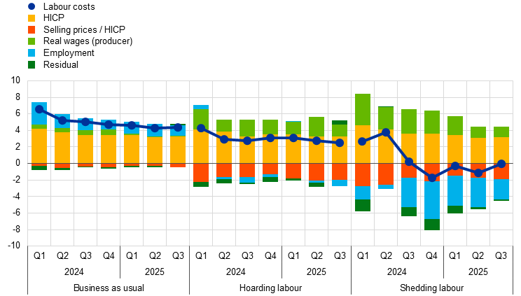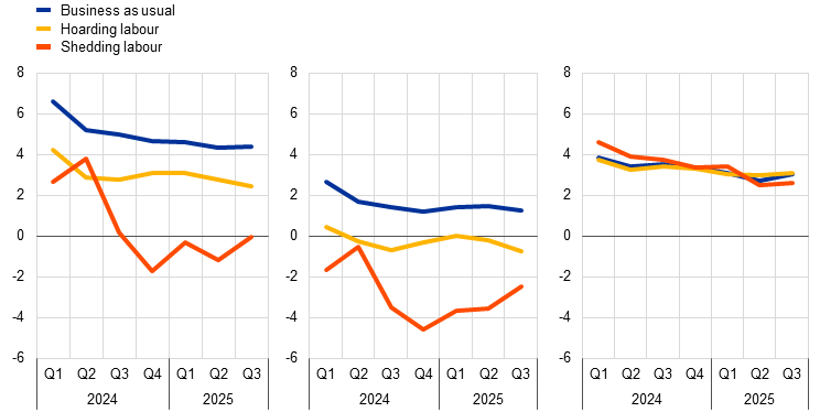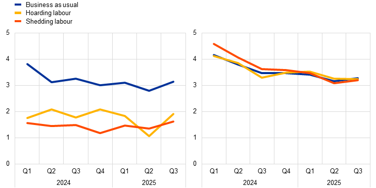 Notes: The “business as usual” category includes firms that have not reported a past deterioration in their specific business conditions; firms in the “hoarding labour” group have faced adverse shocks but have not reduced their workforce during the last quarter and firms in the “shedding labour” group have faced adverse shocks and have reduced their workforce. Firms’ expectations are for the next quarter. Levels above 50 signal an increase and levels below 50 indicate a decrease. The latest observations are for the third quarter of 2025.