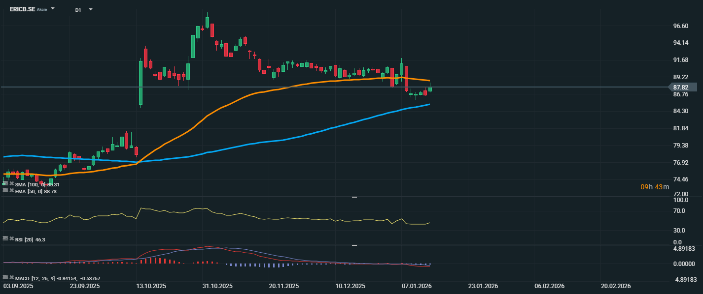 Akcie společnosti Ericsson se aktuálně obchodují na ceně 87,82 SEK a po sérii poklesů se snaží stabilizovat nad klíčovým klouzavým průměrem SMA 100 (86,31 SEK). Cena je však mírně pod EMA 50 (88,73 SEK), což značí zatím neutrální až lehce negativní technické nastavení. Průraz nad EMA 50 by mohl zlepšit krátkodobý výhled. RSI se pohybuje na hodnotě 46,3, tedy v neutrálním pásmu a nenaznačuje extrémní tržní stav, ale spíše chybějící momentální směr. Klíčovou technickou hranicí pro další vývoj bude překonání EMA 50, zatímco SMA 100 nyní slouží jako důležitá podpora.