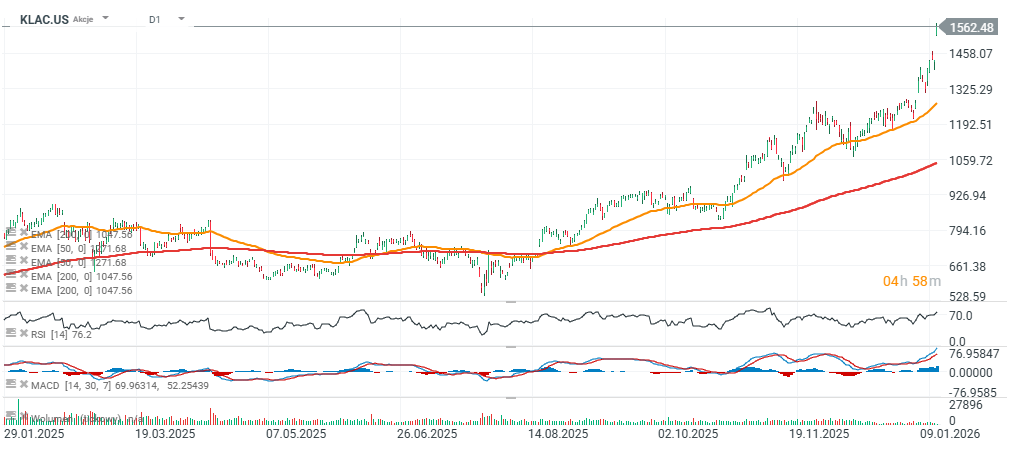Ochota investorů platit rekordní valuace za společnosti těžící z růstu, což je patrné například na firmách profitujících z boomu v paměťových technologiích, jako je KLA Corp. (KLAC.US).