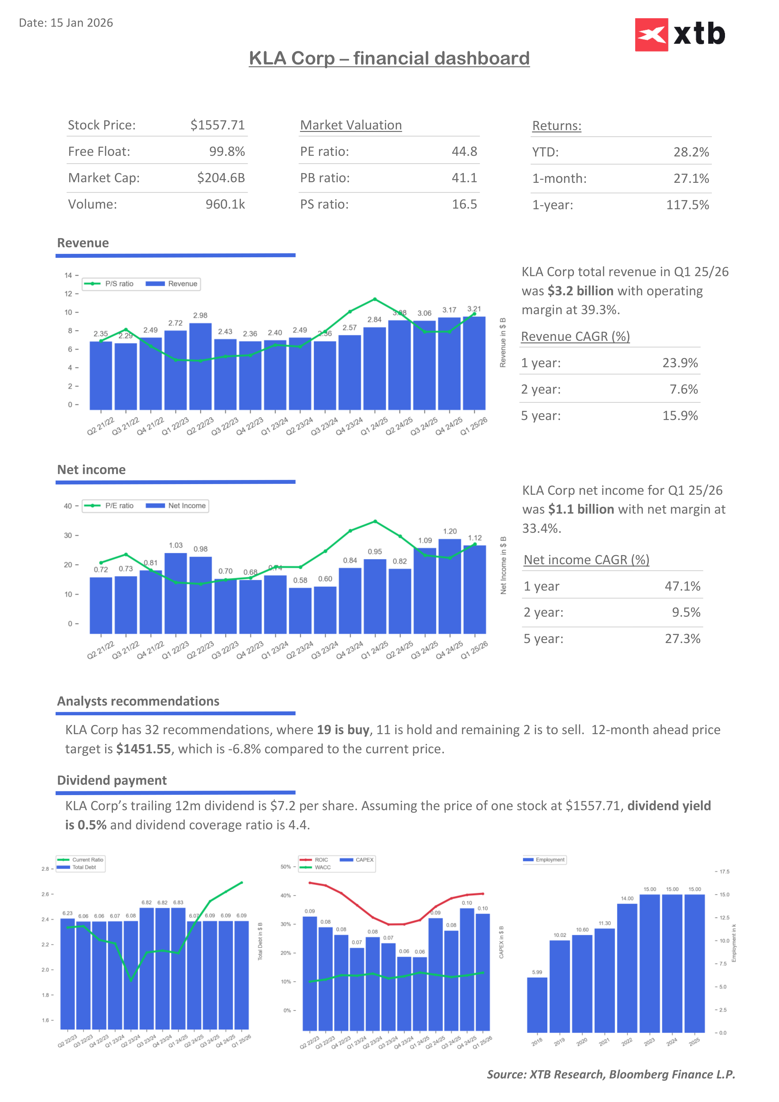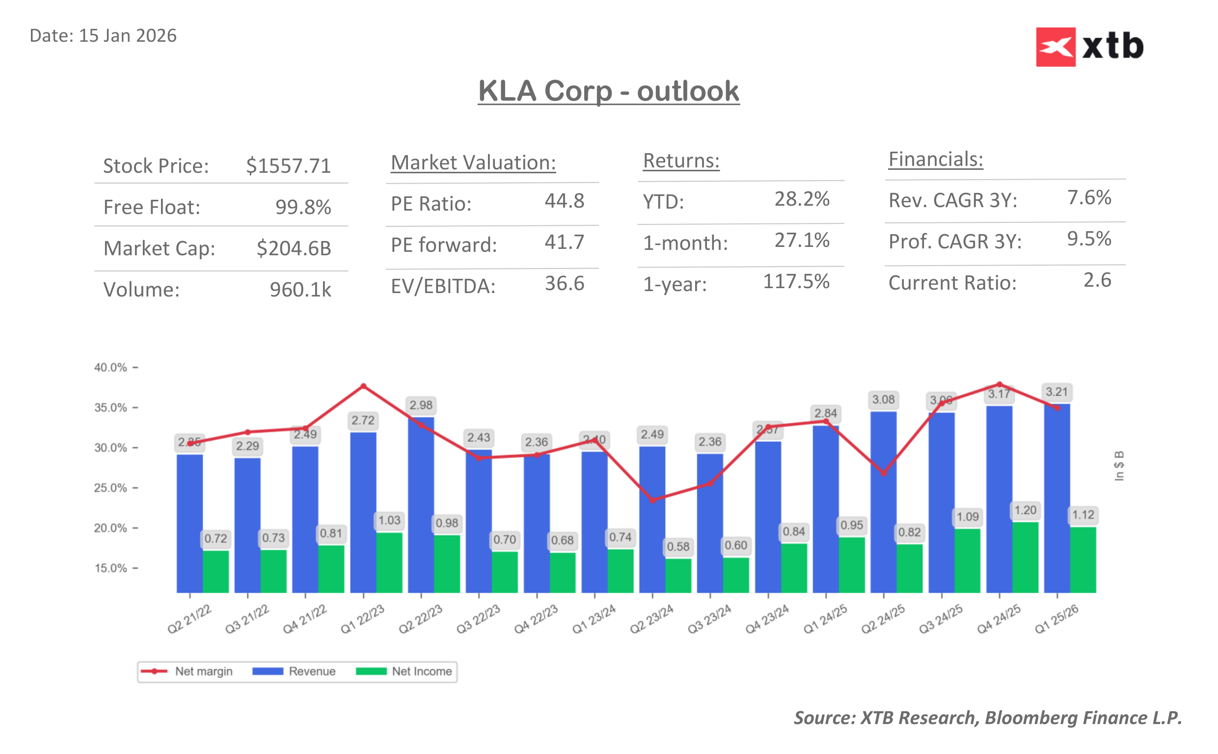 Akcie KLA dnes dosahují nových historických maxim. Hlavní americké finanční instituce, včetně Morgan Stanley a Wells Fargo, zvýšily cílové ceny akcií, pozitivně se vyjádřila také Barclays a RBC Capital zahájila pokrývání akcie.