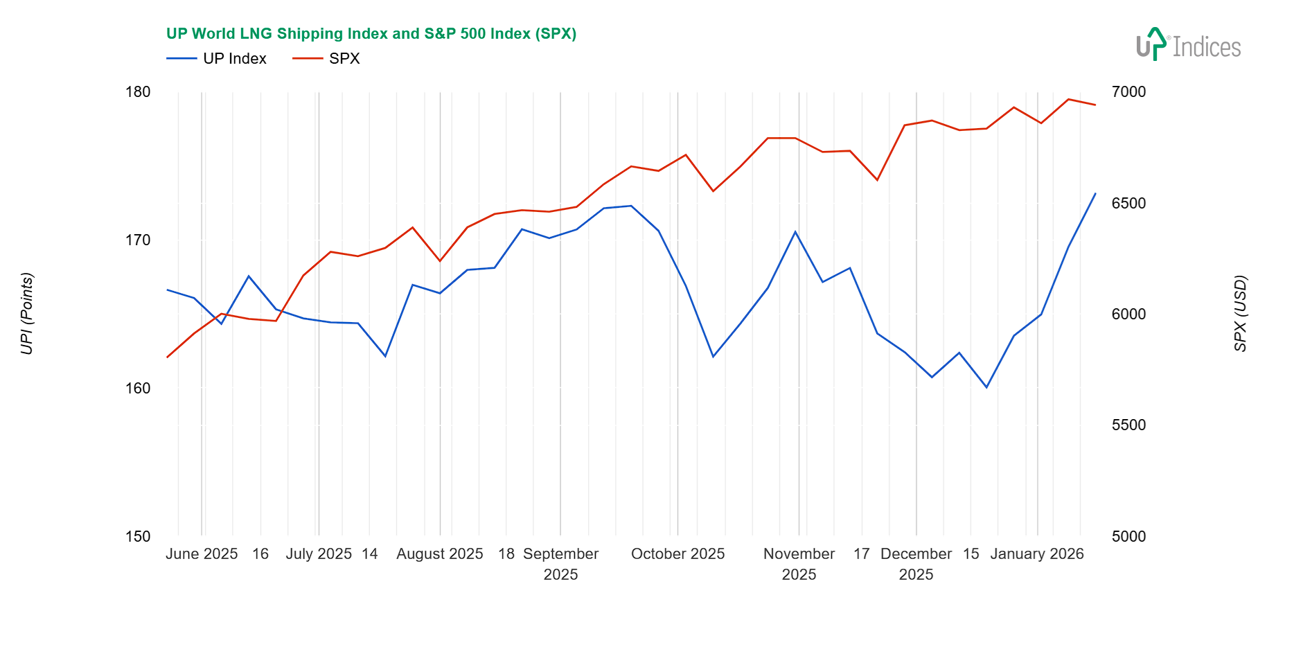 Index UP World LNG Shipping Index, který sleduje kótované společnosti zabývající se přepravou LNG, získal 3,64 bodu (2,15 %) a uzavřel na 173,18 bodech, zatímco index S&P 500 ztratil 0,38 %. Níže uvedený graf ilustruje výkonnost obou indexů na základě týdenních údajů.