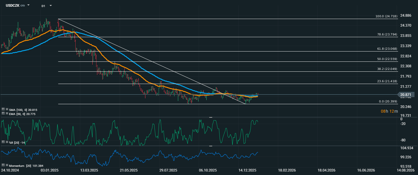 Měnový pár USD/CZK se po většinu posledních měsíců nacházel v sestupném trendu.Tento sestup se však zdá být přerušen – cena totiž prorazila nad sestupnou trendovou linii, čímž vytvořila první signál možného obratu trendu. Aktuálně se kurz pohybuje na úrovni 20,87 CZK/USD, tedy nad důležitými klouzavými průměry – EMA 50 (20,78) i SMA 100 (20,81). Tento průraz naznačuje zvyšující se nákupní zájem a možný začátek růstové korekce. Z hlediska Fibonacciho retracementu je nyní cena nad výchozí úrovní (0,0 na 20,39) a pod rezistencí ležící na hladině 21,42 (23,6 %). Momentum se pohybuje vysoko na hodnotě 101,38, což signalizuje sílu rostoucího impulsu. Také Williams %R je v překoupeném pásmu (–14), což sice může indikovat krátkodobé zpomalení, ale celkově potvrzuje převahu býků.