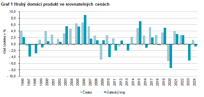 Regionální hrubý domácí produkt Ústeckého kraje dosáhl v roce 2024 v běžných cenách hodnoty 415 172 mil. Kč a byl od roku 1995 nejvyšší. K nominálnímu růstu došlo ve všech krajích republiky, v Ústeckém kraji představoval 2,7 % a byl mezi kraji druhý nejnižší. Ú loha kraje v rámci republiky postupně klesala, v roce 2024 se kraj na tvorbě HDP ČR podílel 5,2 %, proti 7,6 % v roce 1995. Za posledních 30 let byl podíl kraje na HDP Česka nejnižší právě v roce 2024. V mezikrajovém srovnání je pořadí podílu Ústeckého kraje na Česku trvale páté nejvyšší.