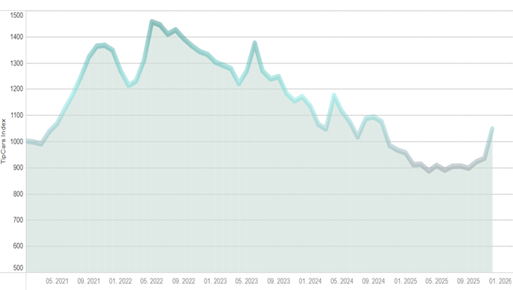 Trh s ojetými vozy uzavřel rok 2025 výrazným posílením. TipCars Index v prosinci meziměsíčně vzrostl o 11,9 % a dosáhl hodnoty 1 047,1 bodu, což je nejvyšší úroveň celého roku a zároveň nejvyšší hodnota od října 2024. Zatímco jarní a letní měsíce přinesly mimořádně nízké hodnoty indexu výhodné zejména pro kupující, závěr roku se nesl ve znamení zlepšujících se podmínek pro prodávající. Vyplývá to z dat inzertního motoristického portálu TipCars.