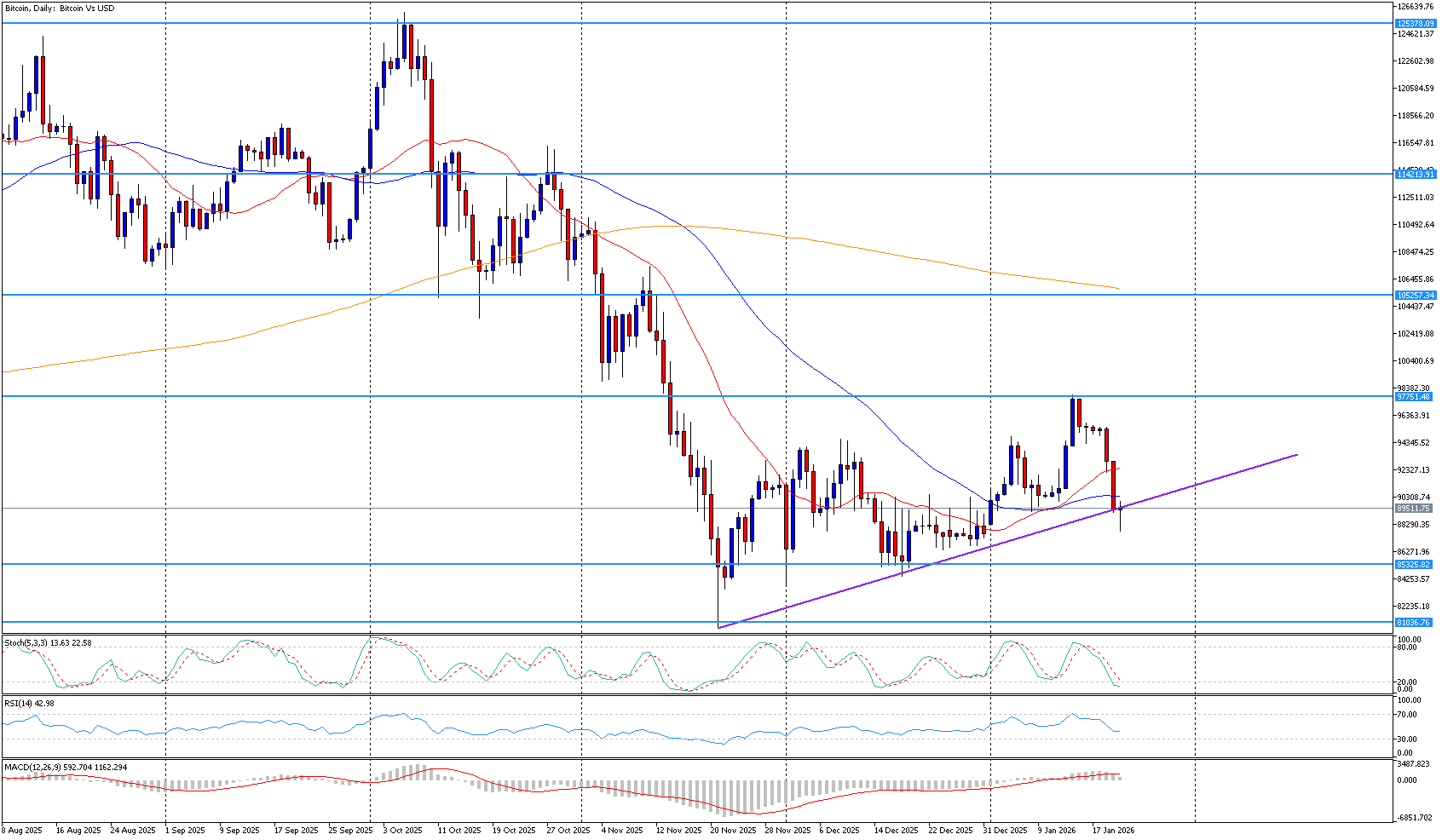 Bitcoin navazuje na slabší vývoj z předchozích dní a prodlužuje dvoudenní pokles, který od minulého týdne přesahuje 4,5 %. Oslabení přišlo poté, co se cena krátce pohybovala poblíž úrovně 98 000, odkud se trh prudce otočil v reakci na rostoucí obchodní napětí ve Spojených státech. Širší výprodej napříč rizikovými aktivy vedl k vymazání nejen většiny týdenních zisků, ale také značné části růstu dosaženého během ledna. Aktuální pokles vrátil cenový vývoj zpět do několikaměsíčního pásma konsolidace mezi 85 000 a 94 000, které zůstávalo s přestávkami respektováno od poloviny listopadu. Bitcoin se nyní nachází v blízkosti důležité oblasti podpory, kde se sbíhá 50denní jednoduchý klouzavý průměr s krátkodobou vzestupnou trendovou linií vedenou rovněž od poloviny listopadu, přibližně v okolí 89 564. Udržení této zóny by mohlo vytvořit základ pro technický odraz směrem k horní hraně pásma poblíž 94 000, čímž by se dočasně zmírnila současná medvědí struktura trhu. V případě výraznějšího oživení by se pozornost trhu mohla znovu přesunout k maximům z minulého týdne poblíž 98 000 a následně k psychologické hranici 100 000. Rizika dalšího poklesu však zůstávají zvýšená. Indikátory momenta se postupně zhoršují, když RSI klesá pod neutrální úroveň 50 bodů, stochastický oscilátor směřuje k přeprodaným hodnotám a MACD ztrácí vzestupnou dynamiku, přestože se stále drží nad nulovou linií. Pokud by došlo k prolomení aktuální podpory, první významnější oporou by mohlo být roční minimum kolem 89 300, následované prosincovými minimy v oblasti 85 000. Další oslabení by otevřelo prostor k testu minima z 21. listopadu na úrovni 80 615, čímž by byl prakticky vymazán celý retracement od posledního rekordního maxima. V krajním scénáři by trh mohl zamířit až k pětiměsíčnímu minimu a úrovni z 9. dubna poblíž 74 576.