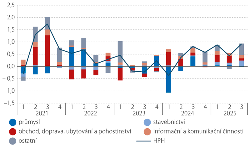 Také vývoj nabídkové strany ekonomiky ukazuje na posilování výkonu tuzemského hospodářství. Celková hrubá přidaná hodnota (HPH) se ve 3. čtvrtletí 2025 mezikvartálně zvýšila o 0,9 %, rostla šestý kvartál v řadě a aktuální tempo bylo nejvyšší za poslední čtyři roky. K růstu v průběhu roku přispívaly zejména stavebnictví, uskupení obchod, doprava, ubytování a pohostinství a rovněž informační a komunikační činnosti. Oživení mělo v zásadě plošný charakter, v samotném 3. čtvrtletí se z hlavních odvětví snižoval výkon pouze v nezpracovatelských průmyslových oborech (zahrnujících zejména těžbu a dobývání či energetiku). Celkový výkon odvětví ekonomiky se tak nacházel o 4,9 % nad vrcholem z období poslední konjunktury (4. čtvrtletí 2019), téměř výhradně ovšem zásluhou služeb (zejména ICT, finančnictví a vyspělých služeb pro podniky).