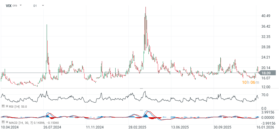 Vlna optimismu na Wall Street tlačí futures na index CBOE VIX níže. Za posledních 30 let existuje jen několik případů, kdy VIX vylétl přibližně o 25 % během jediné seance a následující den uzavřel o 15 % níže. Historicky tento vzorec často předcházel slabší výkonnosti indexů S&P 500 a Nasdaq 100 v následujících dnech, zejména v horizontu jednoho týdne.