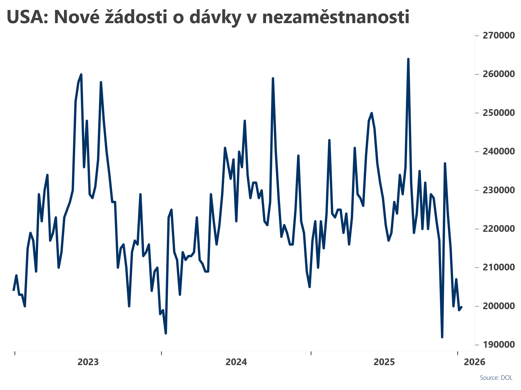 Počet nových žádostí o dávky v nezaměstnanosti v minulém týdnu vzrostly na 200 tis. oproti revidovaným 199 tis. v předminulém týdnu. Trhy očekávaly 209 tis. nových žádostí.