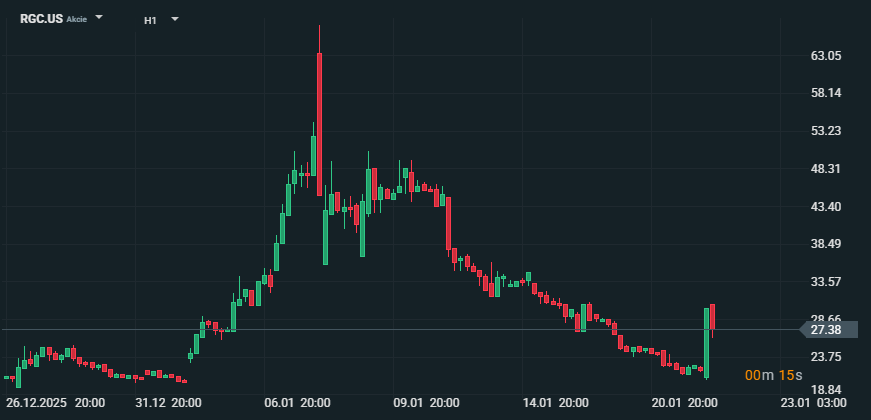 Akcie Regencell zůstávají extrémně volatilní, s častými denními výkyvy o desítky procent. Obchodování tak představuje vysoké riziko, zejména pro méně zkušené investory.