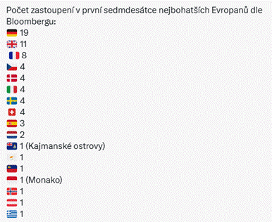 Ze zemí bývalého východního bloku, které jsou nyní členy EU, představuje Česko jedinou zemi, která má v první sedmdesátce i v první stovce nejbohatších Evropanů své zástupce. Polsko, Slovensko, Maďarsko, Slovinsko, Chorvatsko, Rumunsko, Bulharsko, Estonsko, Lotyšsko či Litva nemají v první stovce vesměs nikoho (viz tabulka dle údajů Bloombergu níže). V první sedmdesátce nemají své zástupce Irsko, ani Finsko. V první stovce se pak neumisťuje žádný Portugalec, Belgičan, ani Lucemburčan.