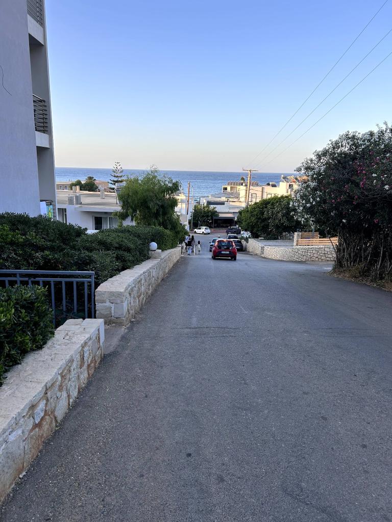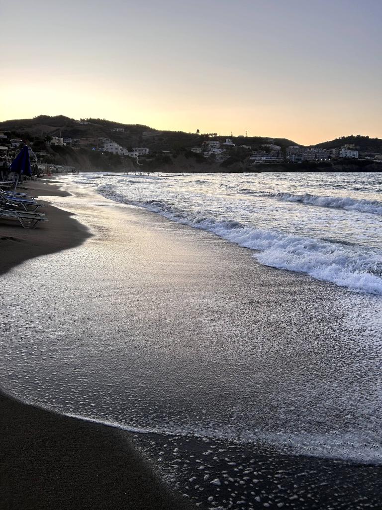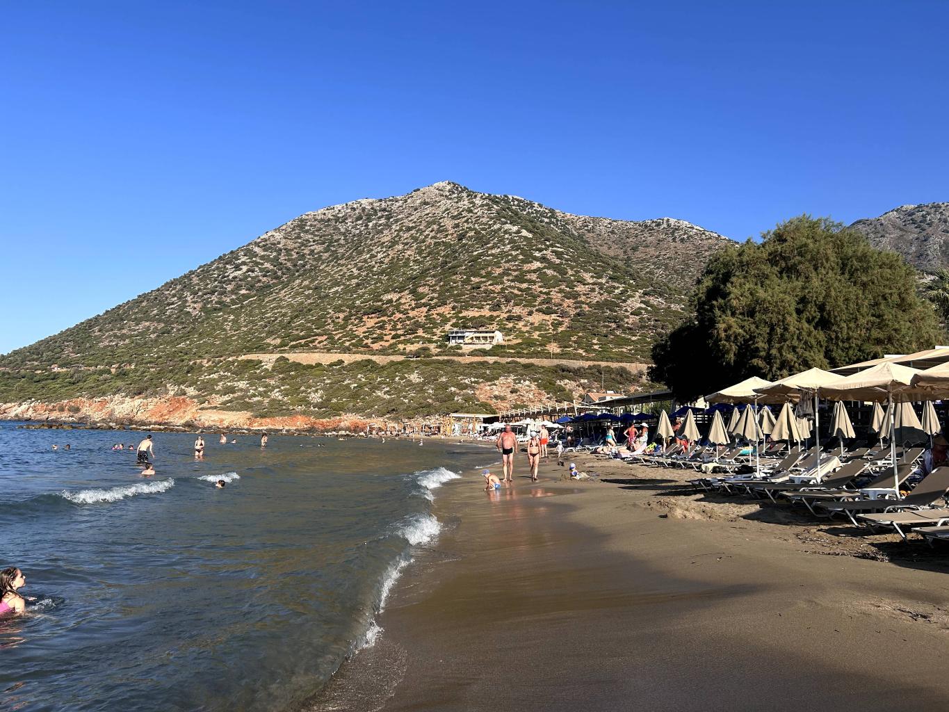 Na pláž vzdálenou 300 metrů se jde kolem hotelové budovy a přes místní hlavní silnici poměrně prudkým kopcem. Na pláži jsou k dispozici lehátka za cca 15-20 €/den, několik barů a obchůdků je kolem krátké promenády. Pláž u hotelu je písečná, občas jsme ve vodě narazili na velký balvan, ale jinak samý písek s velmi pozvolným vstupem, pro děti ideální. Voda průzračně čistá i v hloubce, k vidění byly i rybičky. 2 dny silněji foukalo, takže byly velké vlny, které zapříčinily nános řas na jednu část pláže.