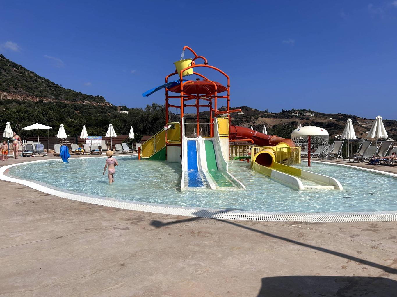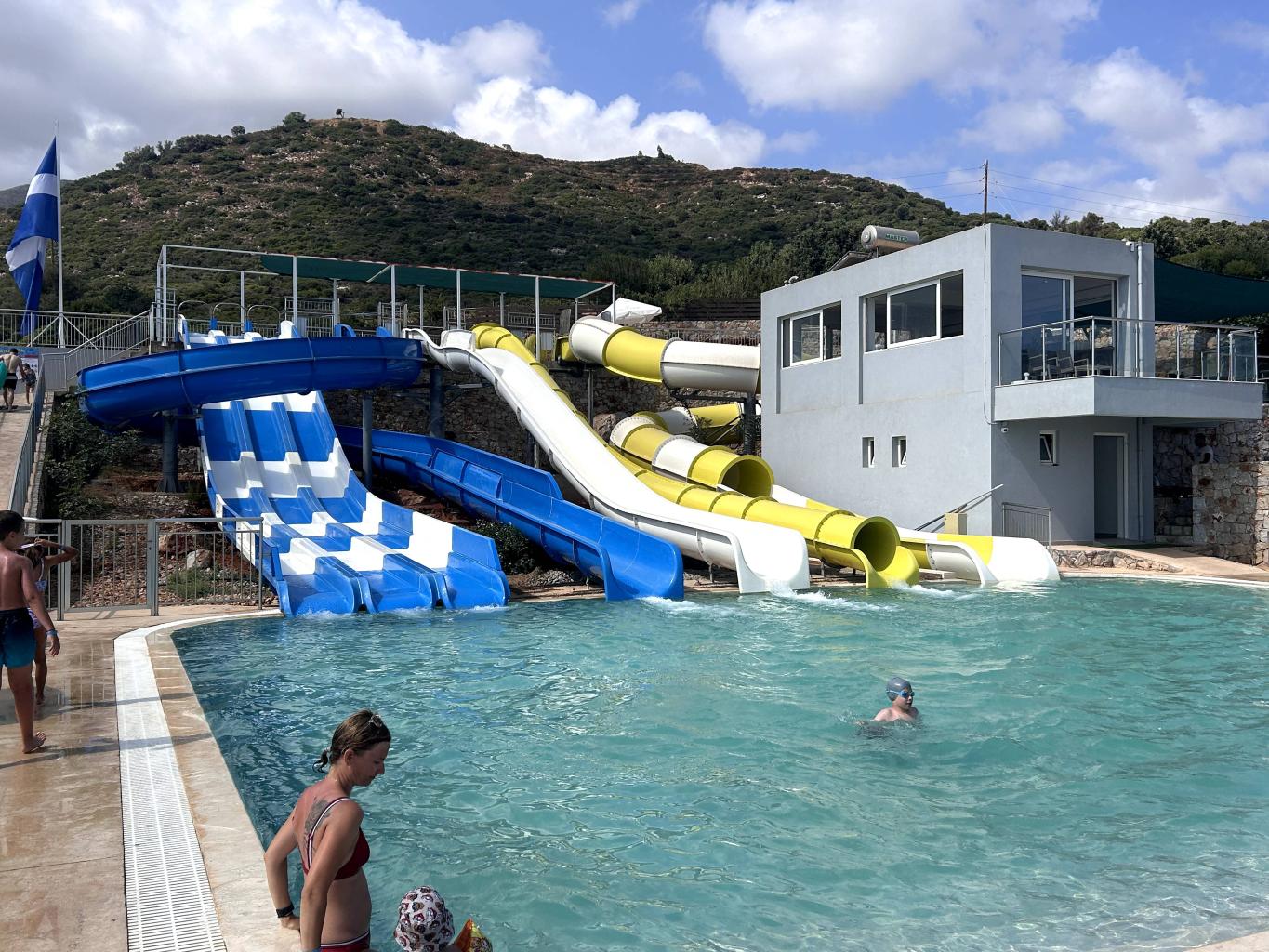 K hotelu náleží na kopci malý aquapark rozdělený na 2 části - část pro malé děti a část pro větší děti a dospělé. Asi 4 tobogány v části pro větší děti jsou od 90 cm, 3 jsou pak od 120 cm. Jeden z nich je sjízdný pouze na nafukovacích kruzích. Plavčíci zde jsou sporadicky, ale překvapilo mě, že všichni byli ohleduplní a vždy si dávali pozor, že člověk před ním dojel v pořádku dolu. U aquaparku jsou k dispozici lehátka a slunečníky, bar a toalety.
