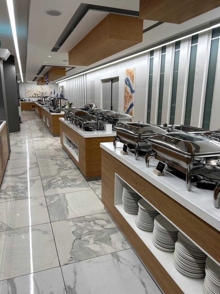 Jídelna je velká, někdy se stalo, že se na místo chvilku čekalo, ale vždy jsme do 3 minut měli stůl připravený, obsluha neustále uklízela, odnášela talíře, doplňovali jídlo, jediné, na co se chvíli čekalo, byla pizza.