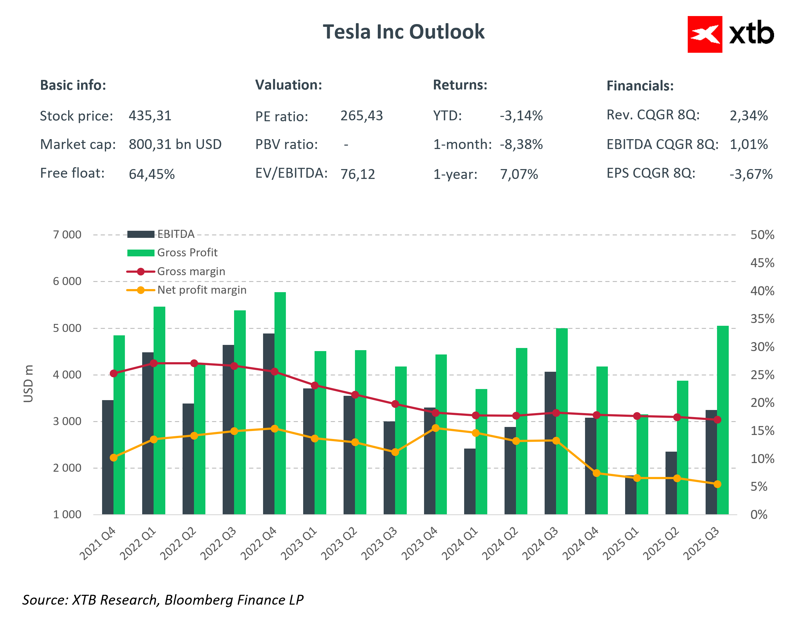 Významná část investorů přestala sledovat finanční ukazatele či tvrdá data. Existuje velká skupina akcionářů, která se soustředí především na oznámení týkající se vývoje FSD (plně autonomního řízení) a tzv. „robotaxi“. Tesla bude mít velké potíže naplnit i tato konzervativní očekávání ziskovosti. Pokud však společnost představí slibné ukazatele související s FSD a robotaxi, může si dočasně udržet současné ocenění – nebo dokonce zaznamenat růst. Naopak absence těchto signálů by mohla po zveřejnění výsledků vést k výraznému výprodeji.