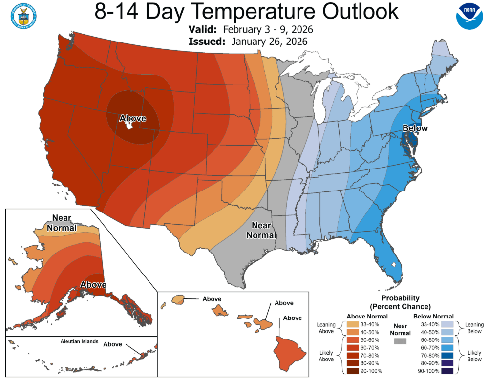 Předpovědi počasí pro USA ukazují, že chladné teploty mohou na východním pobřeží přetrvávat i na začátku února.
