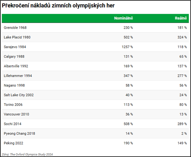 Jedním z nejlépe zdokumentovaných rysů olympijských her je systematické překračování rozpočtů. Studie Oxfordské univerzity potvrzují, že všechny olympiády bez výjimky překročily plánované náklady – u zimních her v průměru o 132 % v reálných cenách, tedy více než dvojnásobek původního rozpočtu. Tento jev není pravděpodobně způsoben jen nepředvídatelnými okolnostmi, ale spíše systematickým podhodnocováním nákladů již ve fázi kandidatury.