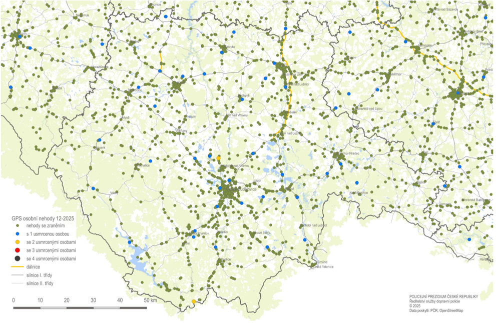 Dopravní nehody s následky na životě a zdraví v Jihočeském kraji v roce 2025