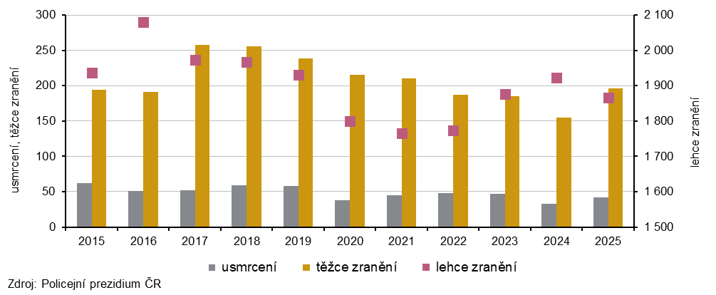 V roce 2025 na silnicích v celé republice zemřelo při dopravních nehodách celkem 421 osob, což bylo o 17 osob méně než v předchozím roce. Podle údajů Policejního prezidia ČR byl počet usmrcených osob v roce 2025 nejnižší v zaznamenané historii.