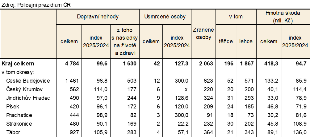 Na jihočeských silnicích došlo v roce 2025 celkem k 4 784 dopravním nehodám, při nichž bylo usmrceno 42 osob, těžce zraněných bylo 196 osob. Lehce se při dopravních nehodách zranilo 1 867 osob. Celková hmotná škoda byla vyčíslena na 418,3 mil. Kč.