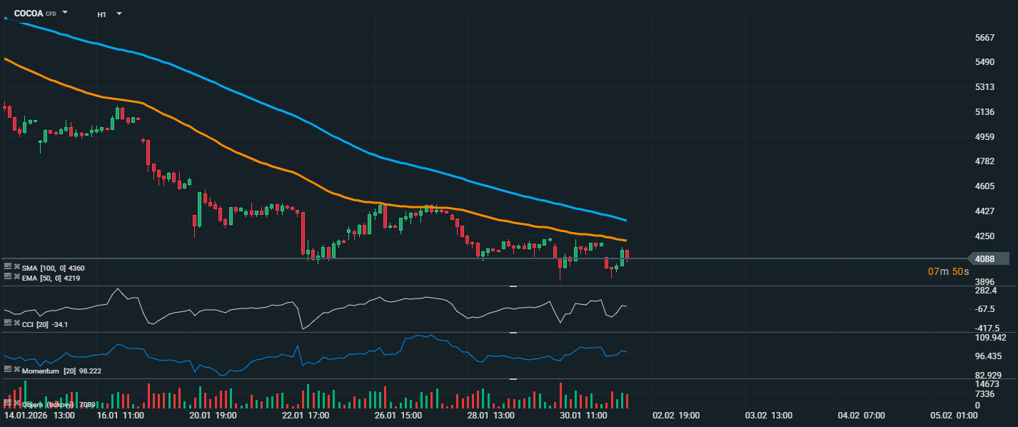 Cena kakaa pokračuje v sestupném trendu a nyní se obchoduje kolem úrovně 4 088 USD, což potvrzuje pokračující tlak. Obchodování probíhá hluboko pod klouzavými průměry – EMA 50 (4 219 USD) i SMA 100 (4 360 USD) – které se nadále svažují, což jednoznačně podporuje medvědí technické nastavení. CCI se drží na úrovni -34,1, tedy v záporném pásmu, které ukazuje na slabý nákupní zájem. Naopak momentum (98,2) je mírně pozitivní, což naznačuje krátkodobý pokus o stabilizaci, ale bez výrazné síly. Objem obchodů zůstává relativně nízký s výjimkou několika nárazových výkyvů, což potvrzuje opatrnost trhu a nedostatek přesvědčivých kupců. Cena se v posledních dnech pohybuje v úzkém rozpětí a každý pokus o růst naráží na odpor v okolí EMA 50.